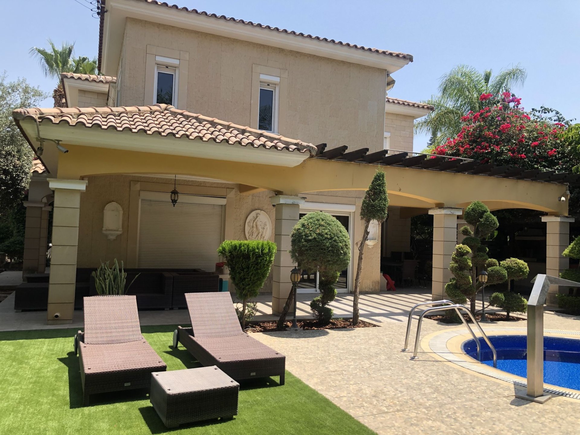 This 4 bedroom villa is located right across the beach in Germasogeia area and in walking distance to the restaurants, shops, schools, cinema, banks etc.The villa was constructed in 2010. It consists of an open plan sitting area with the bar, large kitchen area with laundry and a closed private parking. There is a covered BBQ area at the pool site with the mature garden, the sauna and a jet shower room. The master ensuite bedroom includes a walk-in wardrobe. The villa has decorative cornice on the ceiling in most of the rooms with hidden lights in the falce ceiling and handmade paintings on the walls, large wardrobes in bedrooms and wood parquet floors.