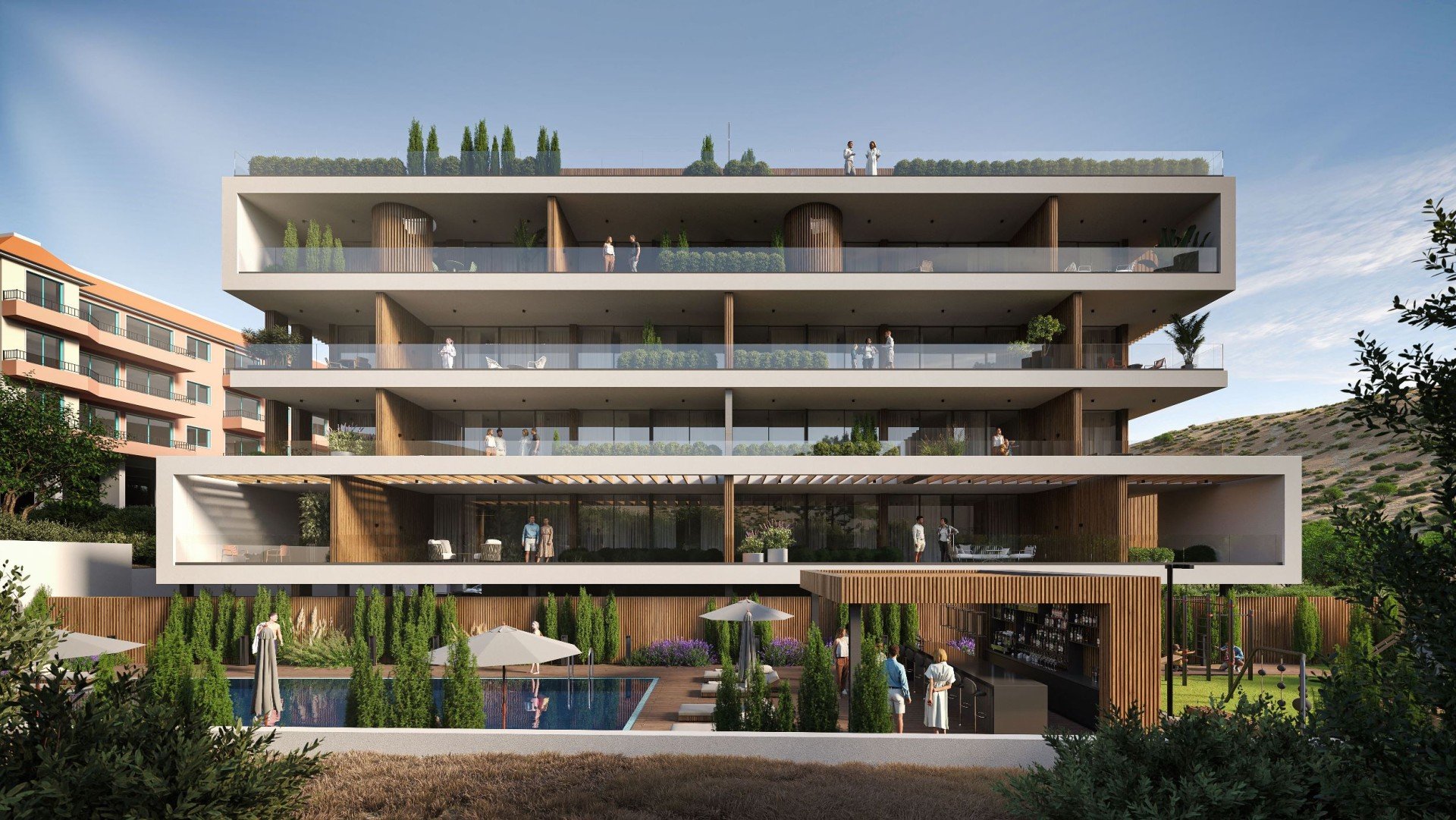 Жилой комплекс расположен в престижном районе Гермасойя. Проект предлагает современный уровень жизни с охраняемой закрытой территорией, удобной парковкой и продуманными общественными пространствами. Для жителей предусмотрены бассейн, терраса для отдыха, детская площадка и зона для барбекю, окруженные озелененной территорией.Апартаменты спроектированы с учетом максимального использования пространства и естественного освещения. Полноразмерные стеклянные двери выходят на балконы с видом на кроны деревьев, а кухни и обеденные зоны открытого типа создают комфортное сочетание внутреннего и наружного пространства.